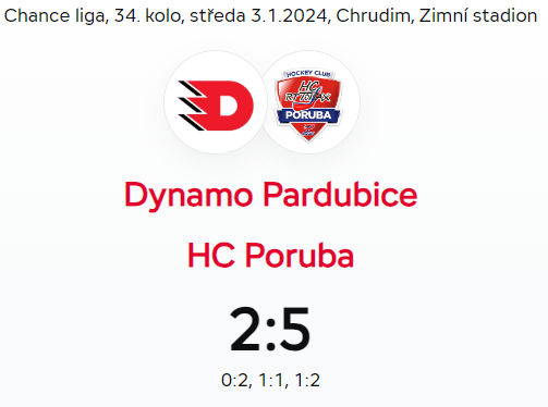 Na chrudimský led dorazil nedostižný lídr základní části – Poruba. Start Dynamu příliš nevyšel, protože v páté minutě po dvou slepených gólech hostů prohrávalo 0:2. Domácí byli útočně laděni, ale nedokázali využívat šance a vedoucí tým Chance ligy trestal sebemenší zaváhání, šlo zejména o nedůraz před brankovištěm a skóre bylo 0:3. To ještě stáhl v přesilovce Herčík. Ale ve třetí třetině se hosté prosadili počtvrté a bylo rozhodnuto. Nic na tom nezměnila ani hra bez brankáře, při které sice Lichtag skóroval, ale následně pátou branku pojistil vítězství Poruby Berisha.