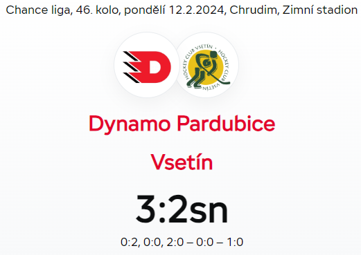 Pardubice B před domácími fanoušky předvedly proti celku z Valaška parádní závěr a vybojovaly důležité dva body! V posledních pěti minutách základní hrací doby se o vyrovnání postarali Rákos s Mikyskou, Dynamo dokonalo obrat v samostatných nájezdech.