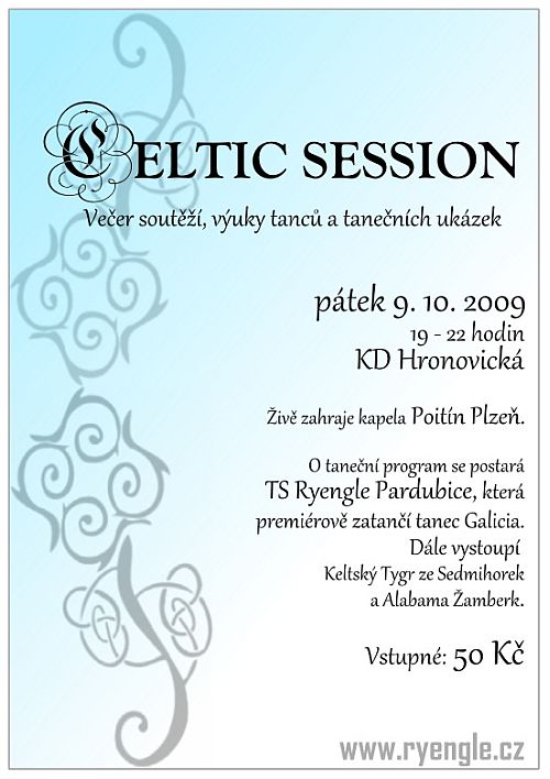 Pardubice, KD Hronovická – netradiční irskou taneční akci si pro Vás na 9. října 2009 připravila Taneční skupina Ryengle ve spolupráci s Kulturním centrem Pardubice. Od 19 do 22 hodiny v KD Hronovická propukne irský taneční večer se živou kapelou.