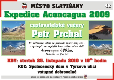 Ve čtvrtek 25. listopadu 2010 v 19 hodin se ve společenském domě v Tyršově ulici ve Slatiňanech uskuteční již 48. Cestovatelský večer. Tentokrát o hoře Aconcagua (6962m).