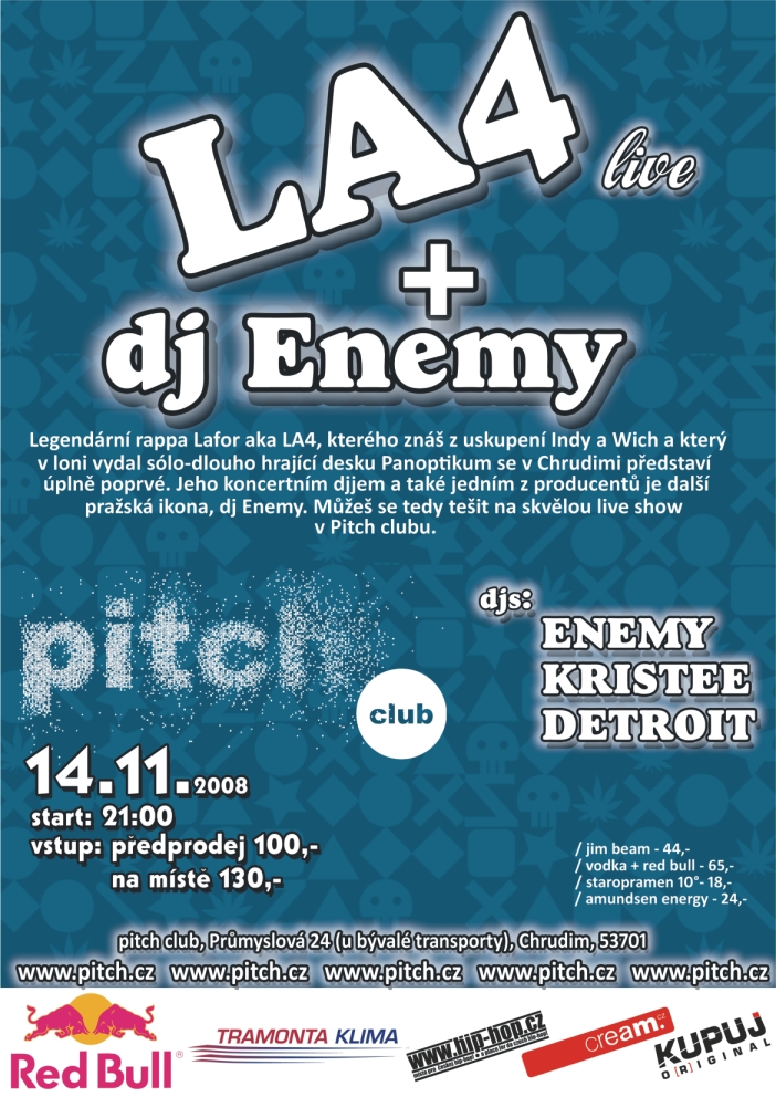 Pitch a black – to je pravidelná akce pro všechny, kteří si rádi dají kvalitní hip-hopovou muziku. Tentokrát vám přivážíme legendární postavu české scény Lafora aka LA4, kterého znáte z uskupení Indy & Wich a který v loňském roce vydal sólo desku Panoptikum. Jeho koncertní DJ je také velmi známý a populární DJ Enemy a ani ten nebude 14.listopadu v Pitchi chybět! Můžete se těšit na skvělou a ojedinělou koncertní show! Jako support DJs se představí populární micina za gramcema Kristee a rezident Detroit.