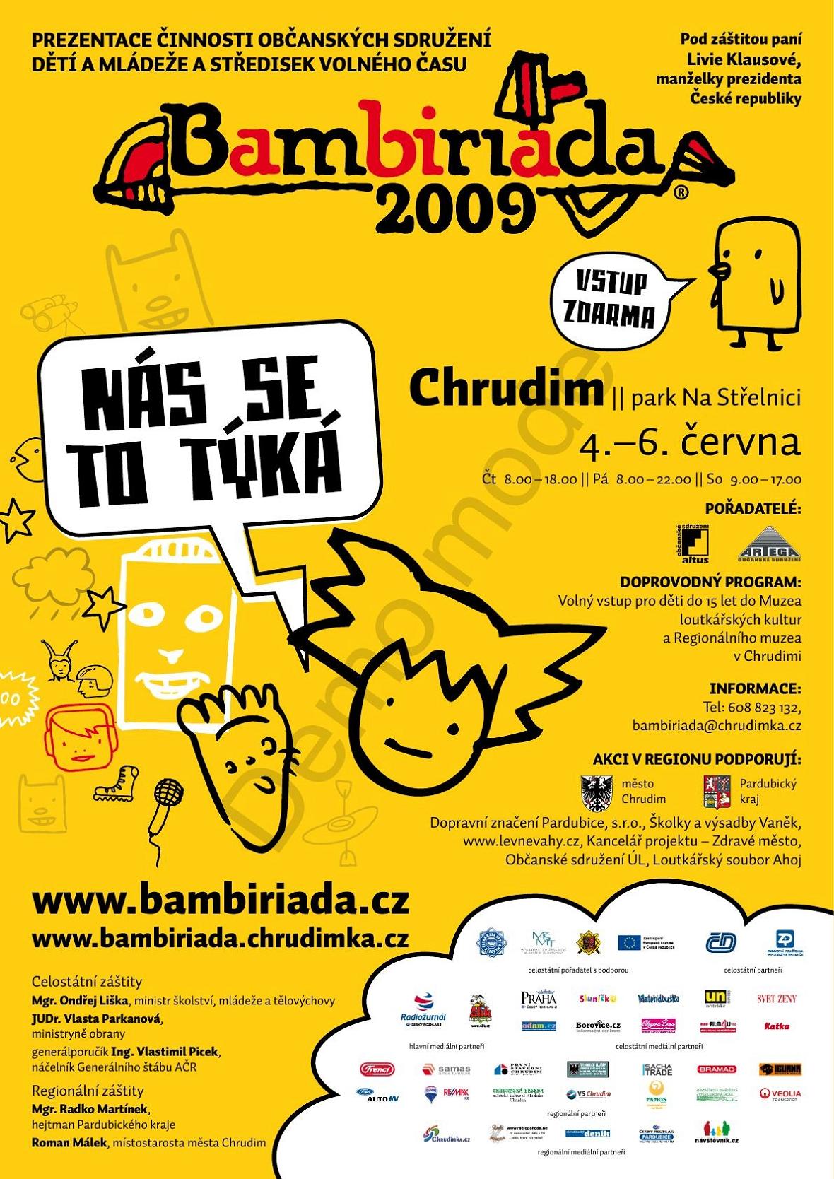 Od čtvrtka 4. do soboty 6. června 2009 proběhne v chrudimském parku Na Střelnici osmý ročník Bambiriády, prezentace činností občanských sdružení dětí a mládeže a středisek volného času. Návštěvníci se můžou těšit na pestrý pódiový program plný tance, zpívaní a divadla. Ani letos nebudete chybět známá osobnost, bude jí Matouš Ruml alias Lexa z oblíbeného seriálu Comeback, který se publiku představí v pátek od 13:00.