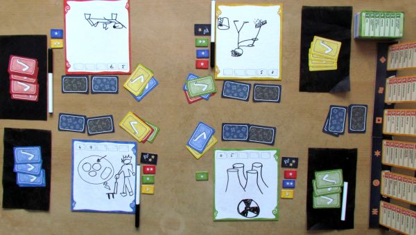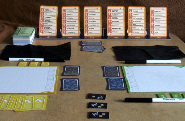 Do středu položíte černé žetony pořadí, které si hráči mohou ukradnout pro sebe na konci kola, podobně jako třeba v autorově Galaxy Truckerovi (recenze). Zbývá pouze určit obtížnost kreslení, ve které se utkají. Na stranu stolu, tak aby na ně všichni dobře viděli, postaví hráči dvojici stojánků a na ně rozloží šest náhodných karet ze zvolené obtížnosti. Nyní má každý pojem na kartách svoji jedinečnou souřadnici – symbol a číslo. A právě tak dostane každý z hráčů svoje první zadání, ale to už vlastně začíná první kolo, takže s chutí do kreslení!