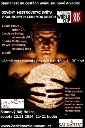 Saunový Ráj v Holicích připravil den plný saunových ceremoniálů. Ve své nové ceremoniálové sauně, která je vybavená hudbou i efektovými světly čeká na návštěvníky desítka saunových show, ceremoniálů, které mají blízko ke krátkým divadelním představením. Moderní saunové ceremoniály znamenají aktuální trend a dokonce se v nich pořádá i mistrovství světa. V Holicích představí mistrovské ceremoniály právě saunoví animátoři, kteří reprezentovali ČR na mistrovstvi světa v Bad Hofgastein v Rakousku. Sobota v Saunovém ráji přinese všem návštěvníkům dostatek zábavy i příjemné relaxace. Show se uskuteční v rámci cyklu SaunaFest na cestách 22. listopadu 2014.