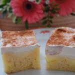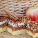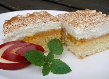 Mezitím dáme oloupaná a na kousky pokrájená jablka dusit. Do nich přidáme cukr, skořici a rum. Neměla by být úplně rozdušená. Do hotových jablek přidáme rozválené asi 4 hrsti piškotů a necháme vychladnout. Do kastrolku dáme 150 ml mléka, do něho nasypeme kokos a cukr a necháme vařit až se mléko vyvaří. Musíme hlídat, aby se kokos nepřipálil. Po vychladnutí zamícháme do zakysané smetany.