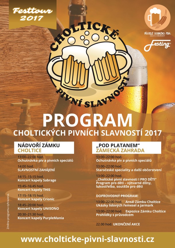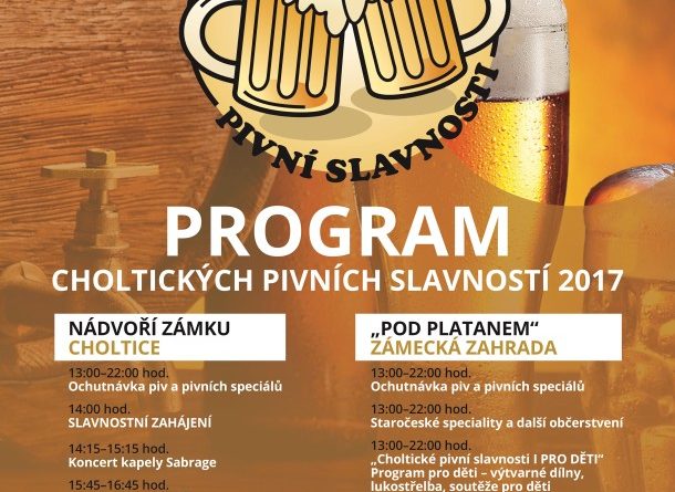 I v roce 2017 připravujeme Choltické pivní slavnosti, které pořádá nezisková organizace Přátelé dobrého piva Čech a Moravy, z.ú. ve spolupráci s agenturou FESTING Hradec Králové a Zámkem Choltice v areálu zámku. Po dva roky jsme zahajovali prázdniny, v letošním roce jsme se rozhodli ke změně termínu a prázdniny zakončit. Důvodem je „nepříznivé“ počasí po oba dva roky na začátku prázdnin – tedy přesněji řečeno tropická vedra, která dle našich informací odradila spoustu návštěvníků. Proto jsme letošní Choltické pivní slavnosti přesunuli na poslední sobotu v srpnu – 26. srpna 2017.