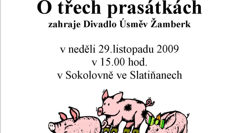 Klub Paprsek a T. J. Sokol Slatiňany všechny srdečně zvou na pohádku pro děti s názvem O třech prasátkách. Divadelní představení zahraje v neděli 29. listopadu 2009 v 15 hodin …