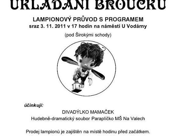 Ve čtvrtek 3. listopadu 2011 od 17 hodin je pro vás připraveno Ukládání broučků – lampiónový průvod s programem. Sraz na náměstí U Vodárny (pod Širokými schody) v Chrudimi, kde bude možné také zakoupit lampion. Kostýmy vítány.