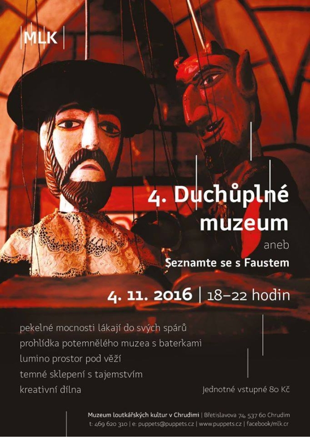 V pátek 4. listopadu 2016 bude Muzeum loutkářských kultur v Chrudimi opět hostit oblíbenou “halloweenskou” akci nazvanou Duchůplné muzeum. Návštěvníkům nabídne možnost netradiční prohlídky budovy muzea i muzejní expozice v hororovém duchu.